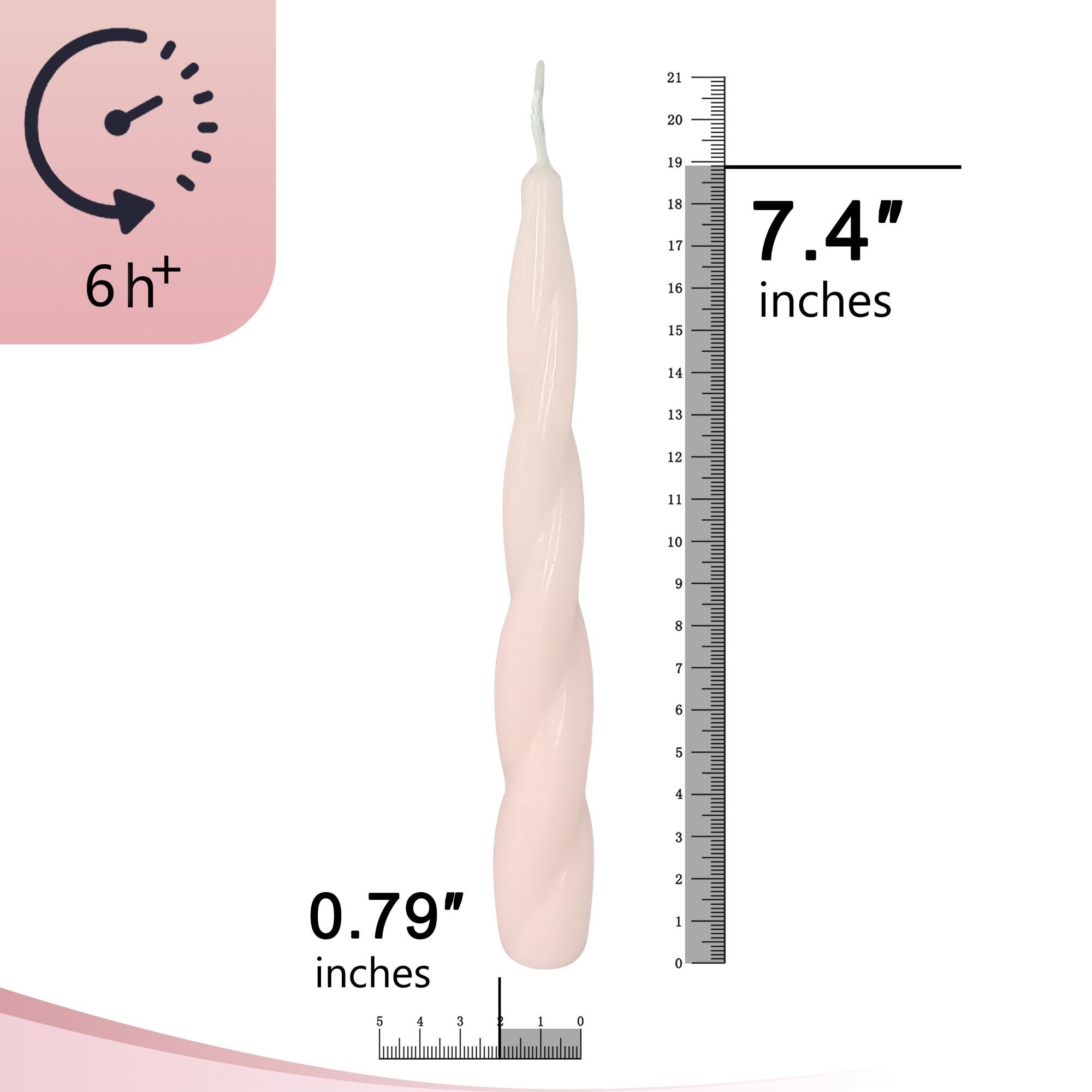 LONG-LASTING BURN CANDLES: Our white candlesticks feature a graceful tall taper shape that allows for a long-lasting burn time. You can enjoy their warm glow for hours on end. The twirl candle are 3/4 inch in size, making them suitable for any standard candlestick holder.