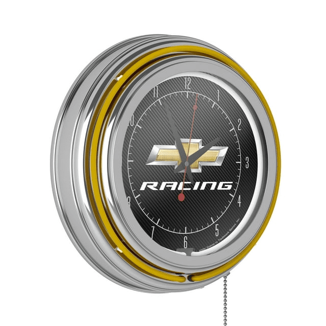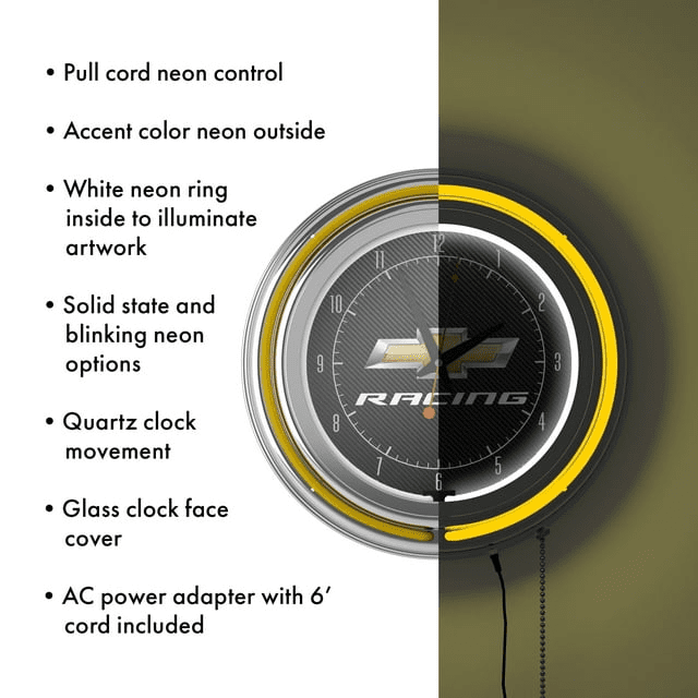 This officially licensed neon wall clock is the perfect addition to any game room, garage or man cave. This impressive clock has two neon rings; one is an accent colored neon ring on the exterior and the other is a brilliant white neon ring on the interior of the clock to light up your favorite logo. Other highlights include chrome finished resin housing and a high-grade glass clock face cover. The battery-operated quartz clock mechanism will keep it ticking for a long time, while the neon runs off the included ac adapter. The neon is controlled by the pull chain and the back of the clock includes a wall hanging mount and has two modes ? Solid state and blinking. The 3? Depth of this clock combined with the radiant shimmer of the neon reflecting off the chrome housing is sure to make this clock pop on any wall!