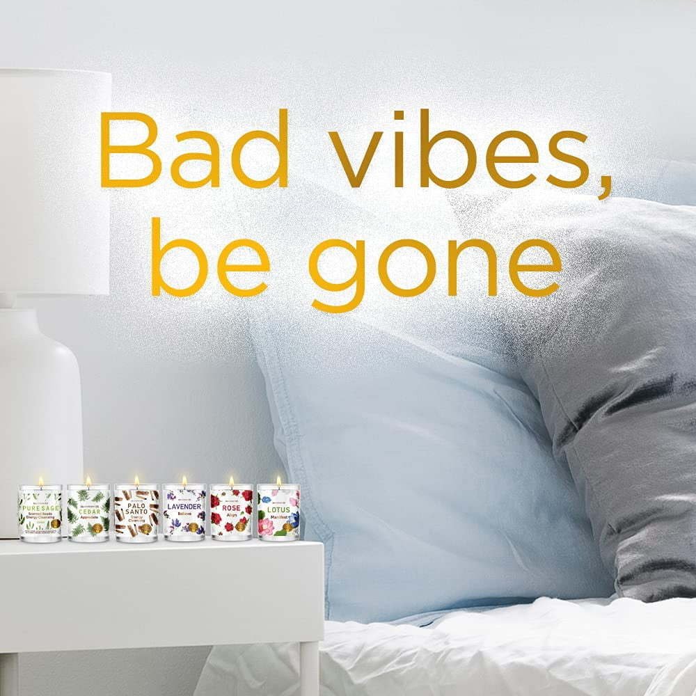 6 AROMATHERAPY TIN CANDLES (3.5oz each) − Made of Natural SoyBean Wax and Essential Oils (SGS and MSDS Report available - No Petroleum or Paraffin Wax). Devoted to clearing, protection, blessings, and manifestations. This blend of scents creates a natural harmony in the home and body.