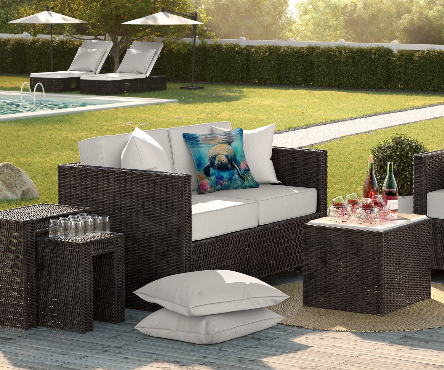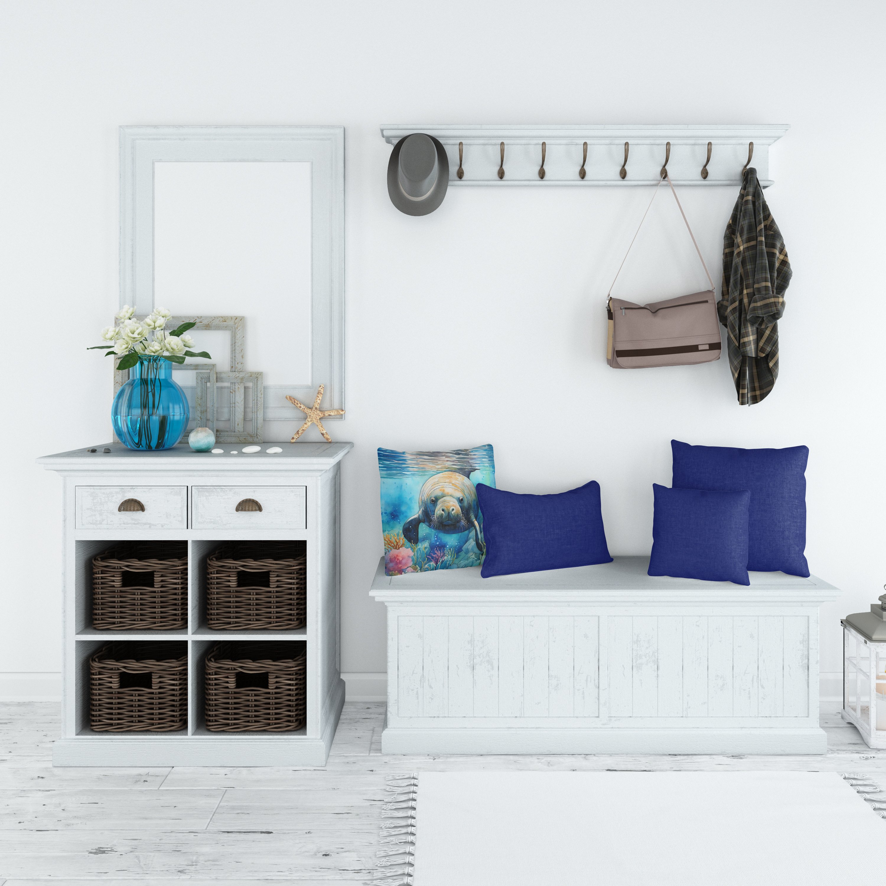 Throw Pillow featuring breed specific Manatee artwork. Revitalize your outdoor or indoor living space with Caroline's Treasures 18x18 Fabric Decorative Pillow. With a generously sized dimension of approximately 18 inches by 18 inches, this pillow makes a comfortable and aesthetic addition to any seating area. Made from a unique, water-resistant material developed by Caroline's Treasures, the pillow sham is 100% polyester fabric that's durable and ready to weather any condition. Its vibrant, full-color artwork will not fade over time as it is dyed with color-fast dyes. Whether you place it on your patio furniture, porch, veranda, or indoor couch, its soft canvas fabric ensures a cozy experience. The pillow is handcrafted in the United States, featuring a sham created from three pieces of fabric and a polyester insert for enduring shape and overstuffed comfort. Despite being robustly built to endure the outdoors, it is as soft and snug as your favorite indoor cushions. Please note, as all our pillows are handmade, sizes may vary slightly, adding to the charm of this unique decorative item.