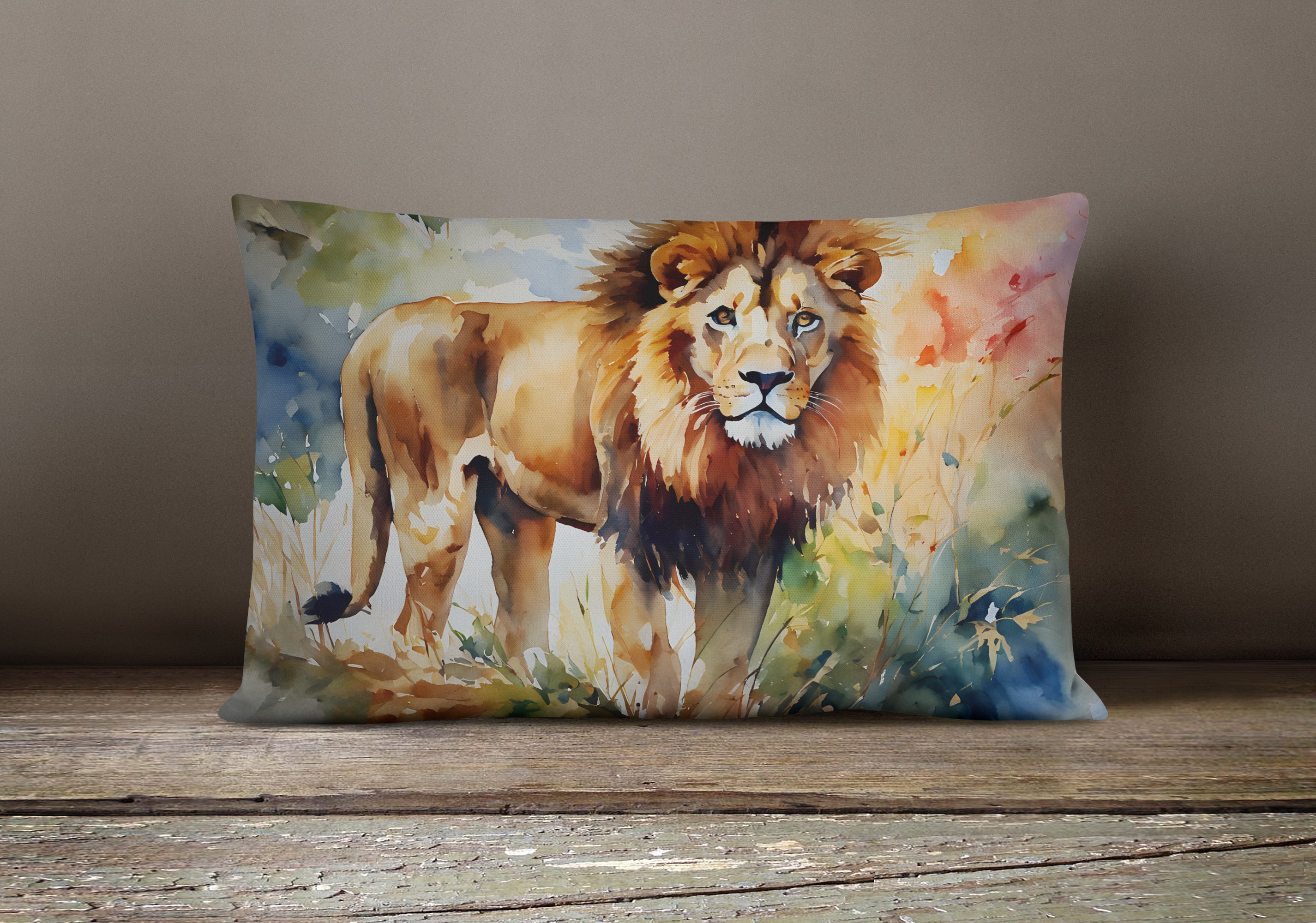 NEW Watercolor Wildlife Throw Pillow Indoor/Outdoor Patio Washable, Lion 2953,12Hx16W