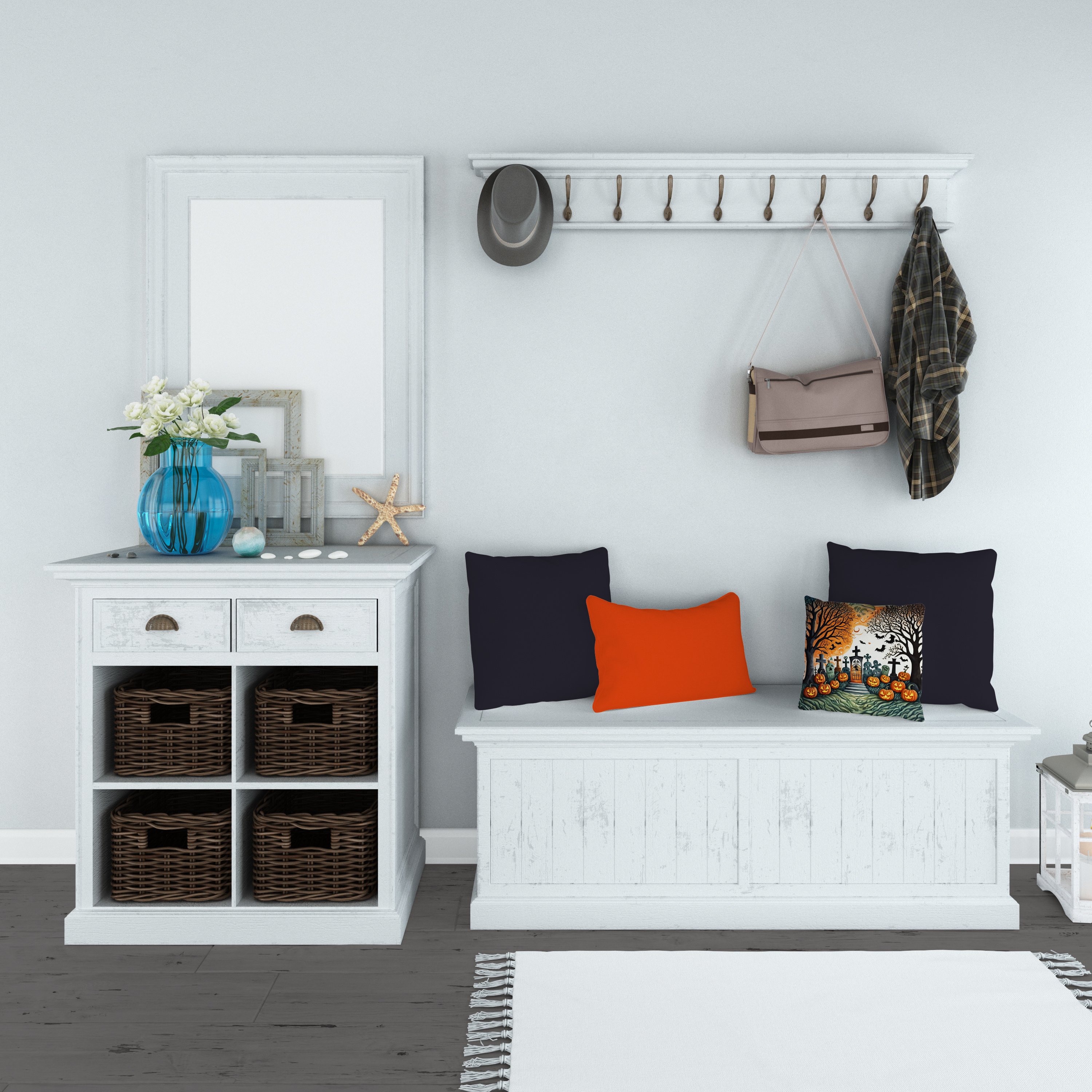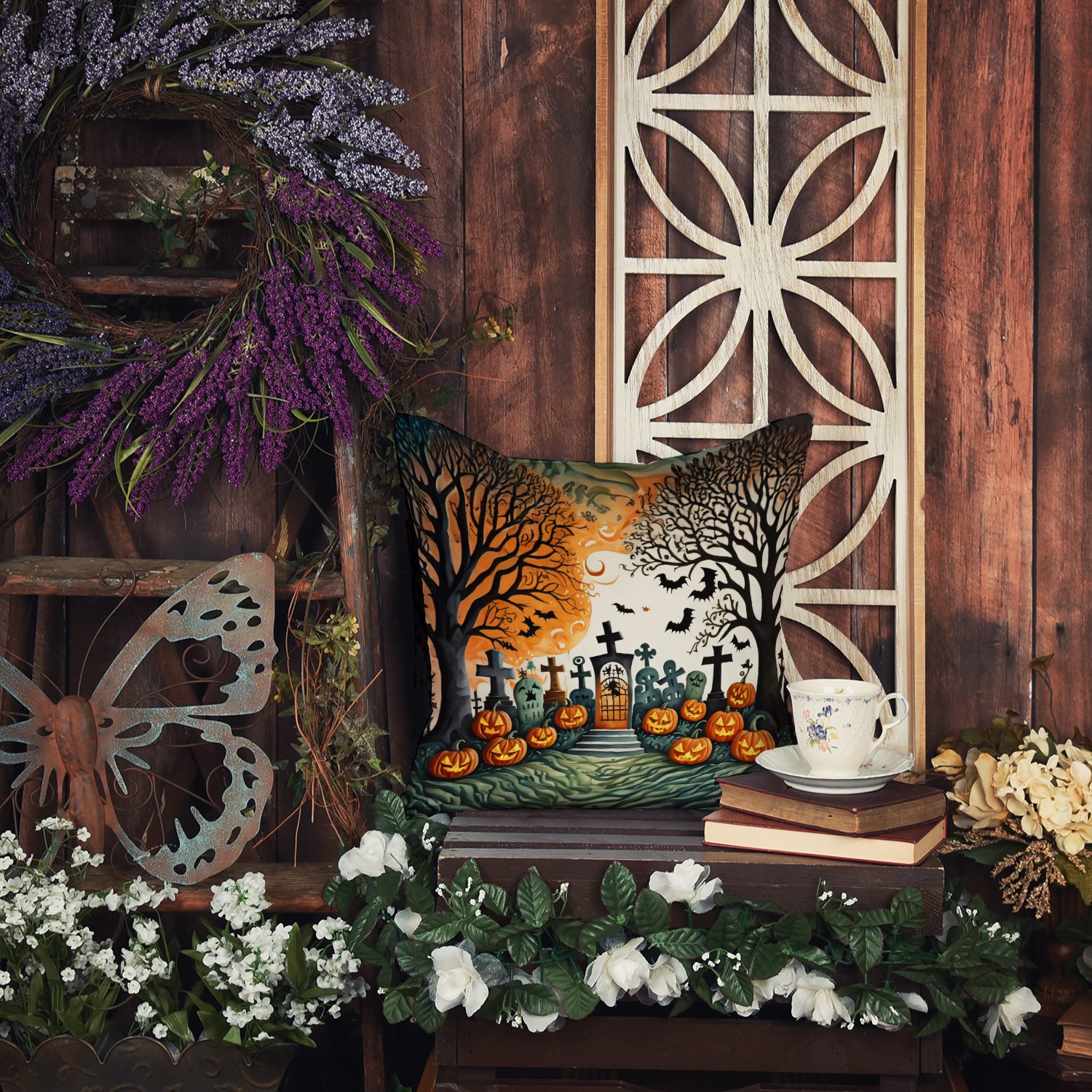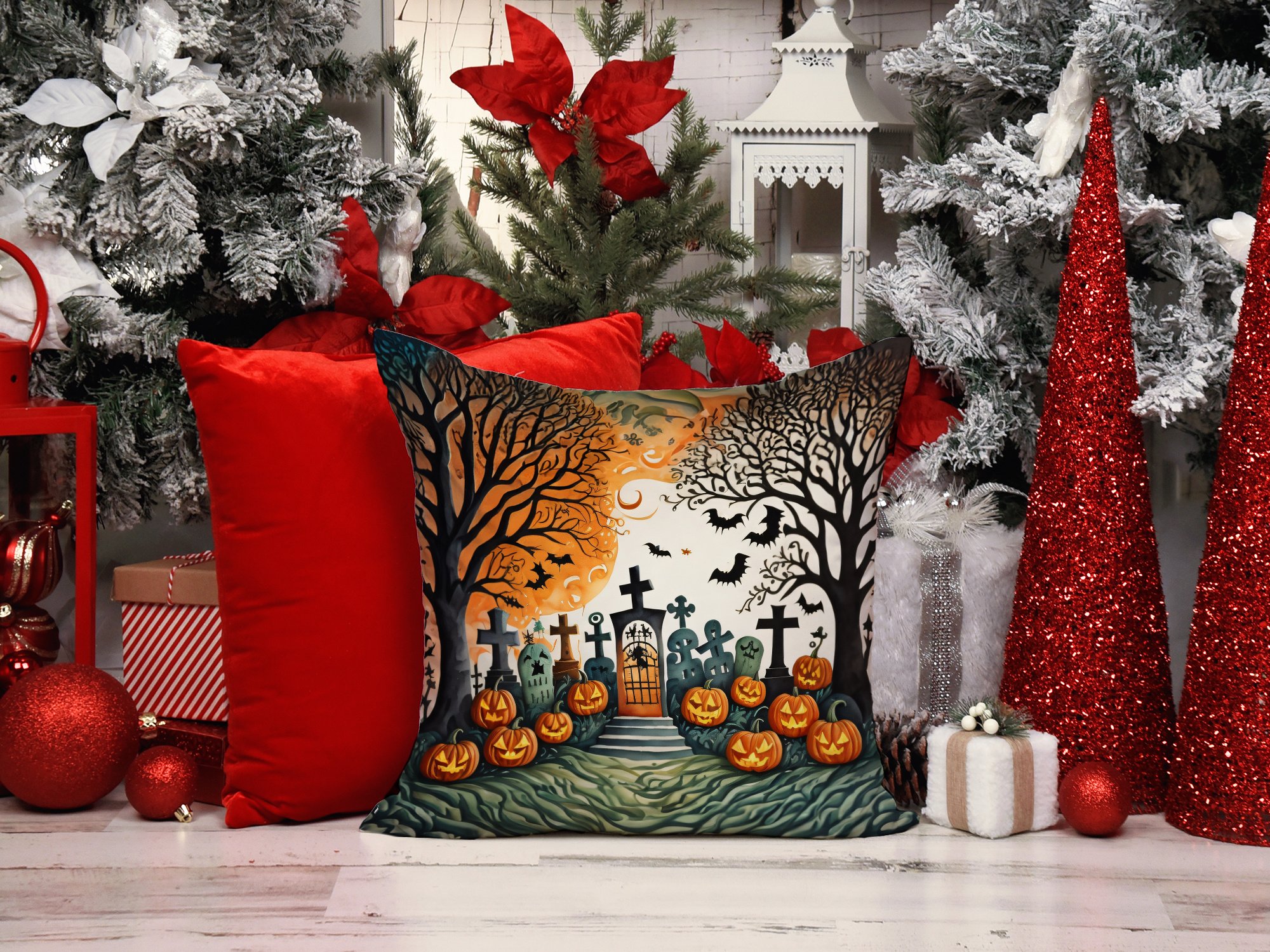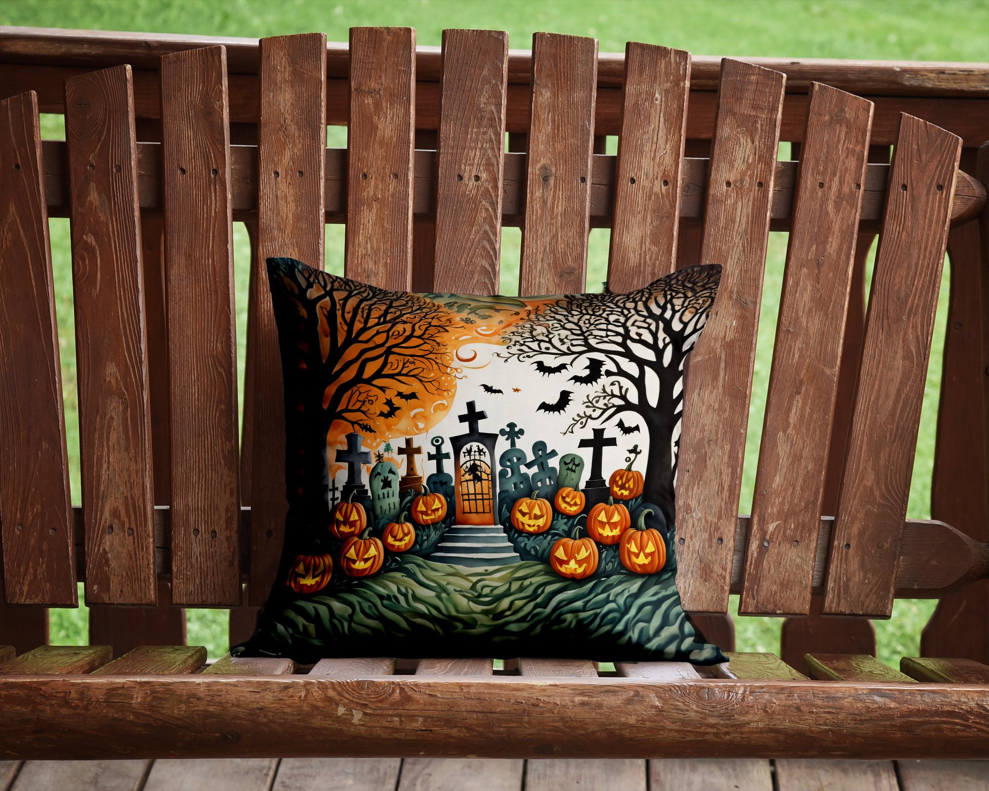 Celebrate Halloween with this Halloween Pillow. Add a touch of vibrancy and comfort to your outdoor seating with Caroline's Treasures Fabric Decorative Pillow. Measuring approximately 14 inches by 14 inches, this outdoor pillow is crafted to elevate the appeal of your patio furniture, infusing it with vivid color and artistic flair. The pillow includes a 100% Polyester Fabric sham filled with a quality pillow form to provide superior comfort. Innovatively made from our brand new material, specifically woven for its water resistance, this pillow is designed for durability. The soft canvas fabric offers versatility in use, fit for your indoor couch or your outdoor patio, porch, or veranda. The fabric is dyed with colorfast dyes built for resilience against weather conditions, ensuring the pillow retains its beauty over time. Constructed by sewing three fabric pieces to create a sham, the polyester insert is then nestled inside to form the pillow, resulting in an overstuffed pillow that maintains its shape. Both the sham and the pillow insert are proudly made in the United States. As the pillows are handcrafted, there may be minor variations in size, further enhancing their unique charm. Experience comfort in style with Caroline's Treasures Fabric Decorative Pillow.