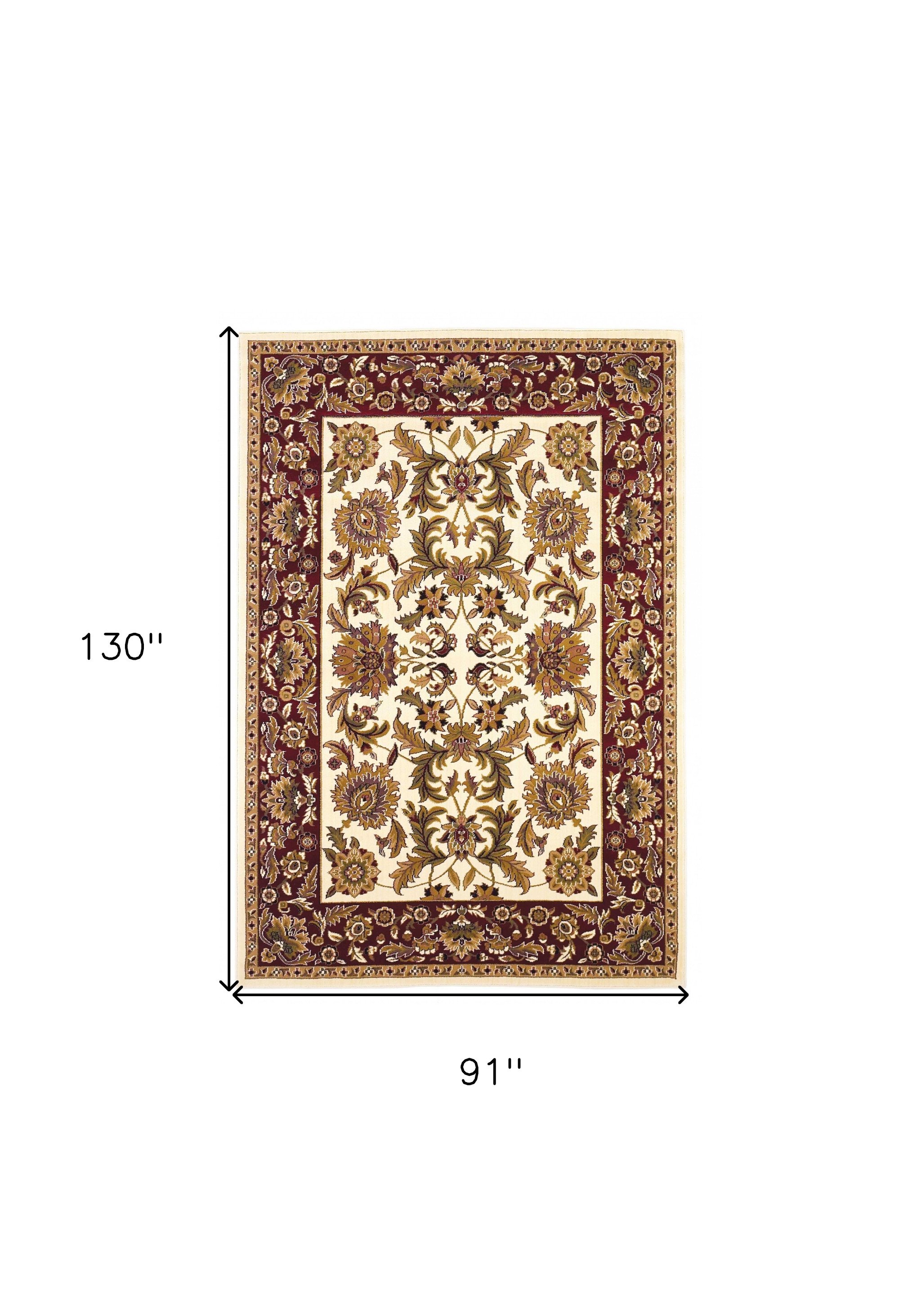 Add a touch of elegance to your home decor with this machine-woven 7-foot x 10-foot red and ivory area rug. Crafted from durable polypropylene, this traditional style rug features a classic rectangle shape that will complement any room. The machine-made construction ensures long-lasting quality and easy maintenance, making it perfect for high-traffic areas. Elevate your living space with this stylish rug that combines great coloration and a comfortable texture, ideal for pairing with hardwood or tile flooring. 91-inch H x 130-inch W x 0.5-inch D
