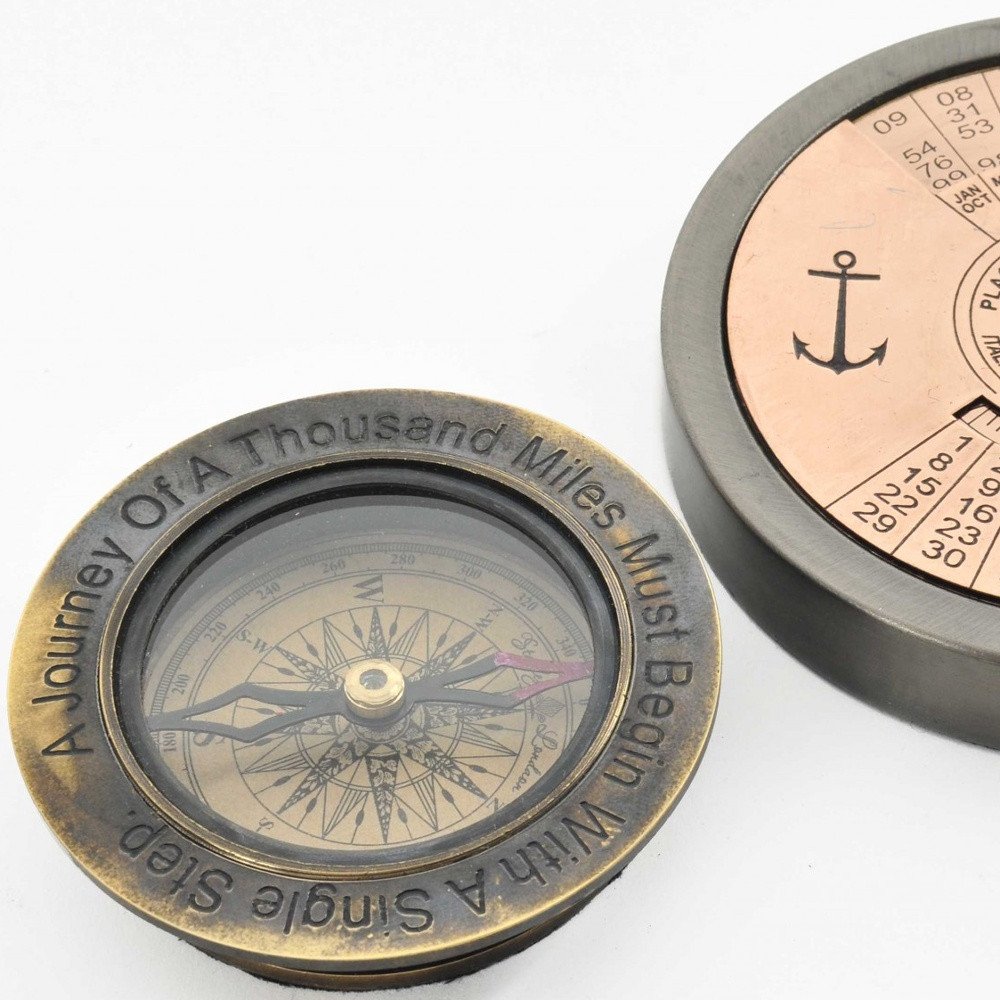 This is set of two functional elegant pieces: a 100 year Calendar and a Compass Quote. The calendar features a brilliant way to track for dates starting from the year 2000 to 2099. The calendar features authentic hand carved and painted numbers and drawings on it. The compass on the other hand features a beautiful quote A journey of a thousand miles must begin with a single step. Both items are made of high quality brass with each component is crafted using the finest craftsmanship. They are available in antique brass finish and are shipped together in one package. Together both would make a great addition to any nautical collection. 100 year Calendar dimension: L: 3.75 inches, W: 3.75 inches, H: 0.5 inches. Compass Quote dimension: L: 3 inches, W: 3 inches, H: 0.75 inches." 3" x 3"
